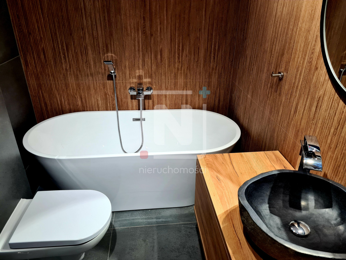 4 m² – z wolnostojącą wanną i kamienną umywalką,