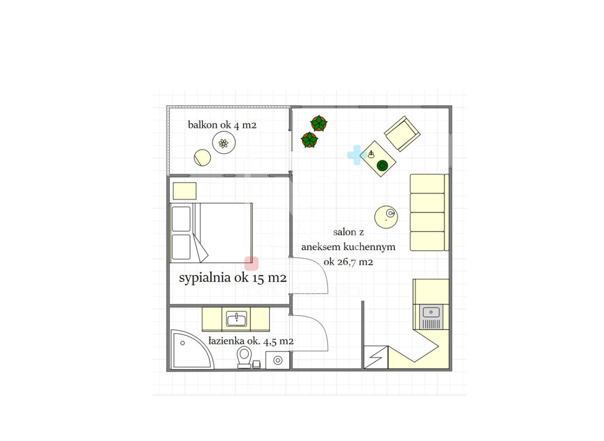 • przestronny salon z balkonem i aneksem kuchennym – idealna przestrzeń do relaksu i spotkań z bliskimi,