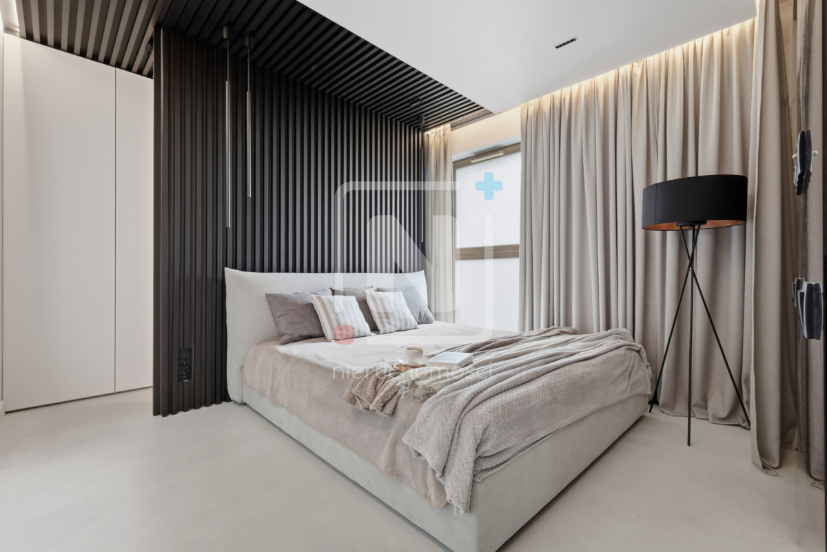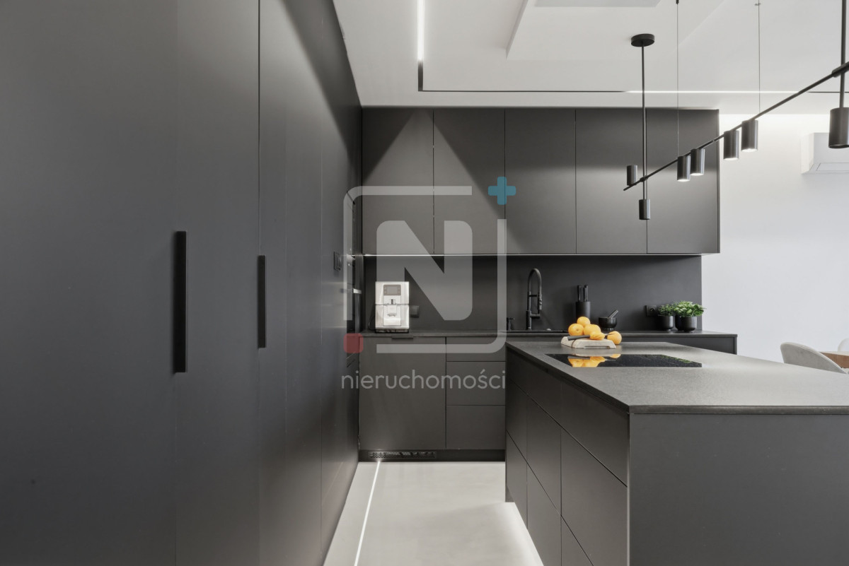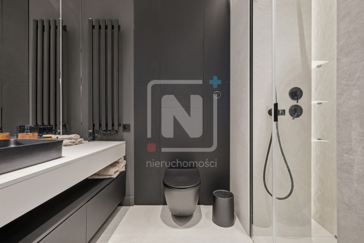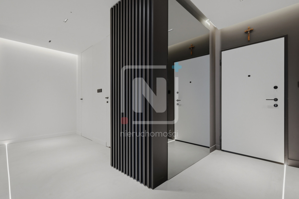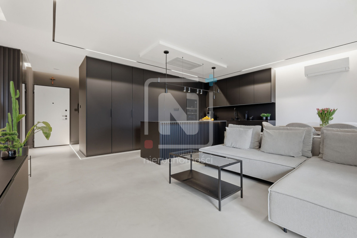 Mieszkanie zostało wykończone w luksusowym standardzie, z dbałością o każdy detal. Na podłogach elegancki mikrocement, który nadaje wnętrzu nowoczesnego i spójnego charakteru. W całym lokalu rozprowadzony został wysokiej klasy system audio, umożliwiający sterowanie muzyką w różnych pomieszczeniach.