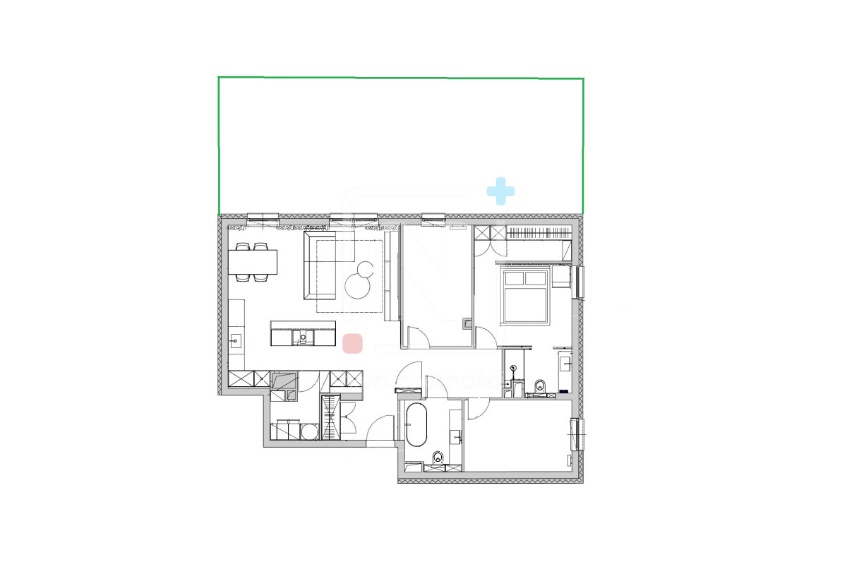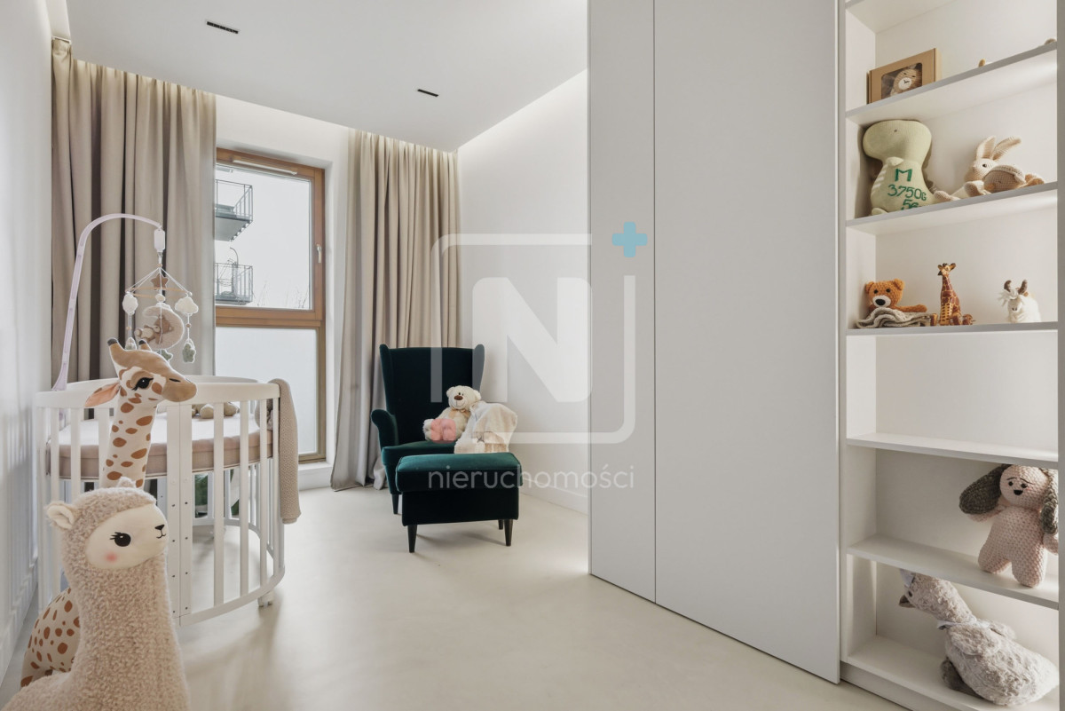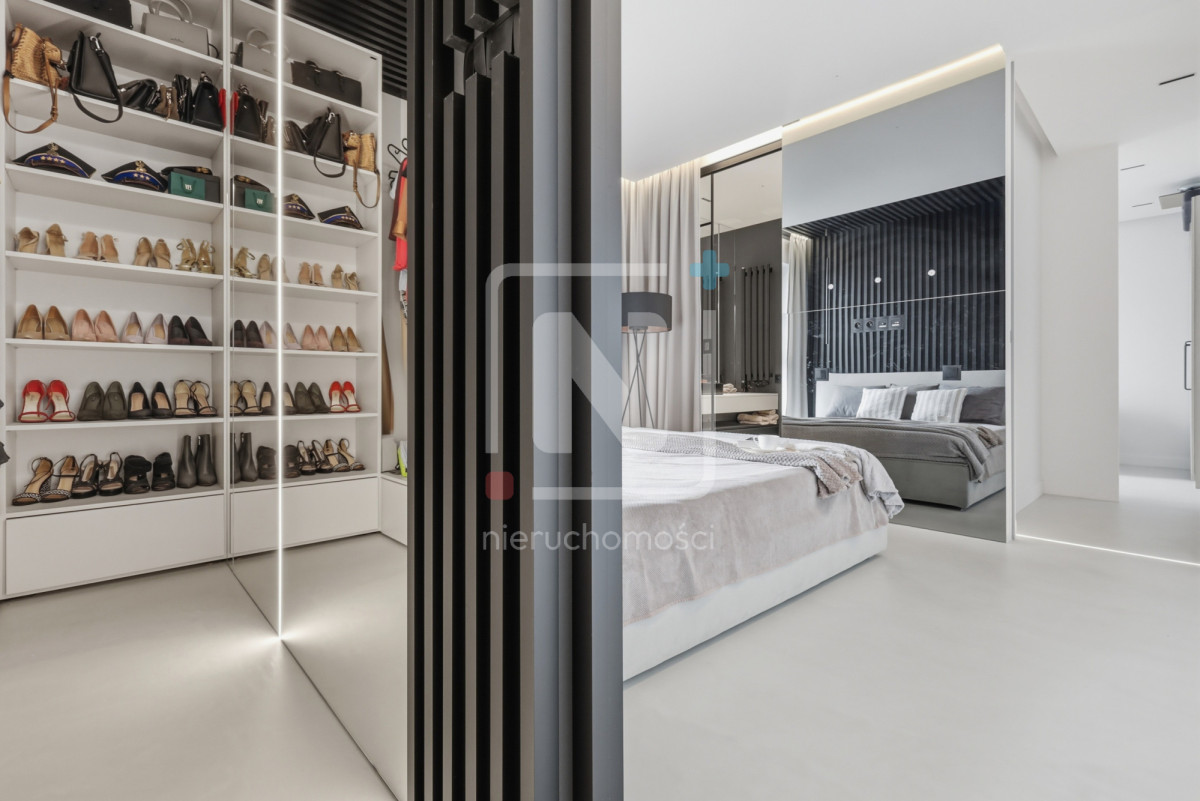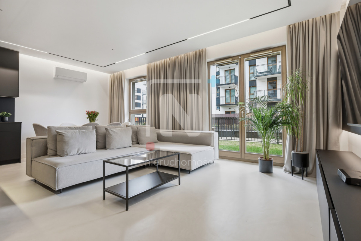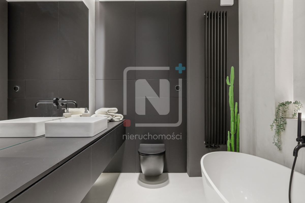 Mieszkanie zostało wykończone w luksusowym standardzie, z dbałością o każdy detal. Na podłogach elegancki mikrocement, który nadaje wnętrzu nowoczesnego i spójnego charakteru. W całym lokalu rozprowadzony został wysokiej klasy system audio, umożliwiający sterowanie muzyką w różnych pomieszczeniach.