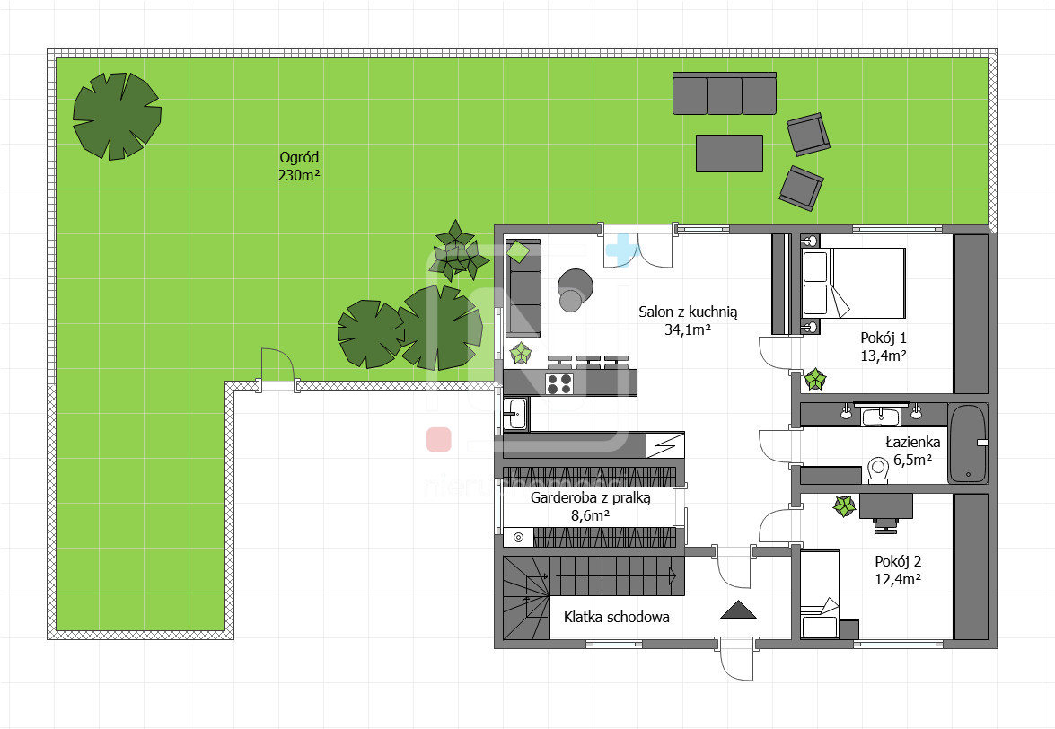 ♦ Ogród: prywatny ogród o powierzchni 230 m² z automatycznym nawodnieniem, idealny do relaksu na świeżym powietrzu (możliwość adaptacji tarasu, zamontowana markiza automatyczna)