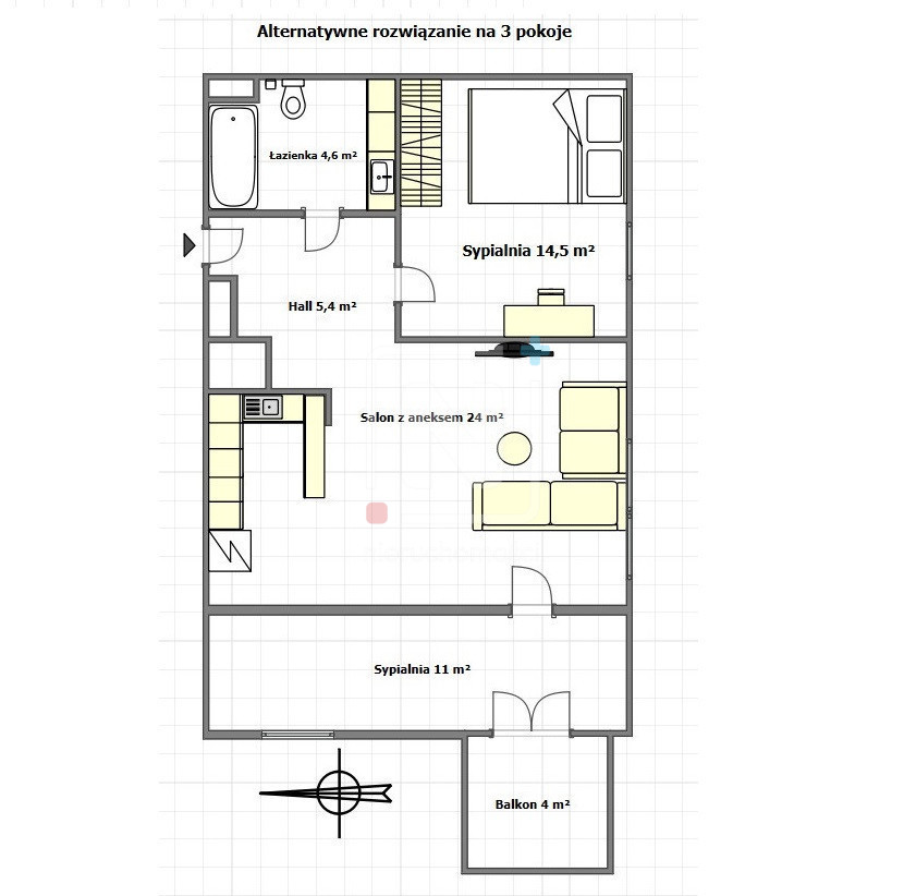 - Możliwość aranżacji mieszkania na 3 pokoje