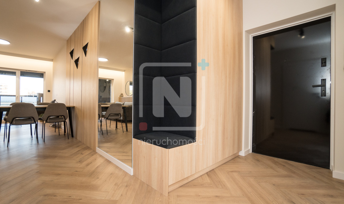 - Funkcjonalny hall z pojemną szafą i welurowym siedziskiem;