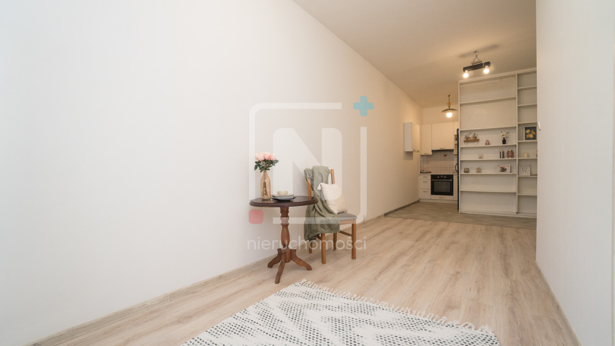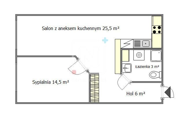 – Salon z aneksem kuchennym + sypialnia + łazienka + hol