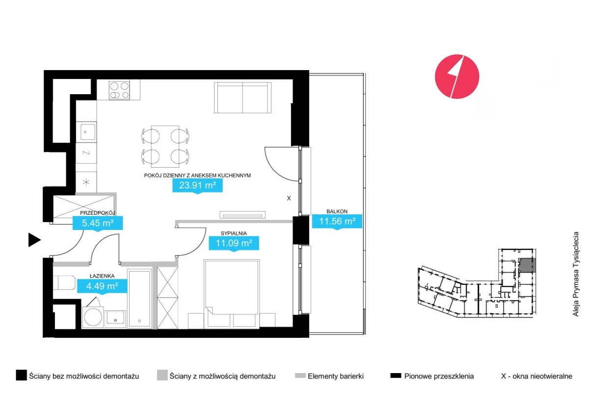 • metraż: 44,94 m² + 1,22 m² powierzchnia pod ściankami