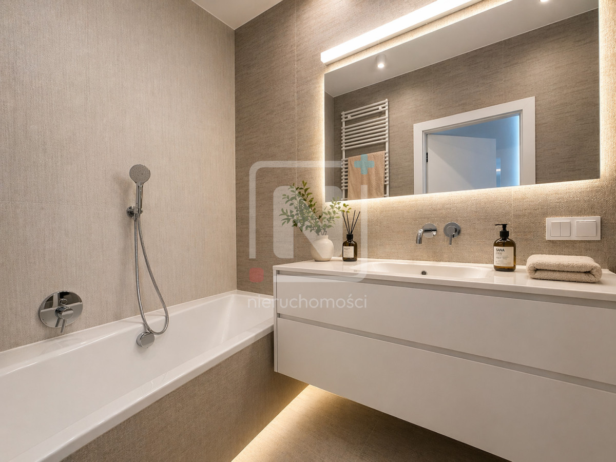 Elegancka, wykończona wysokiej klasy włoskim gresem, wyposażona w wannę.
